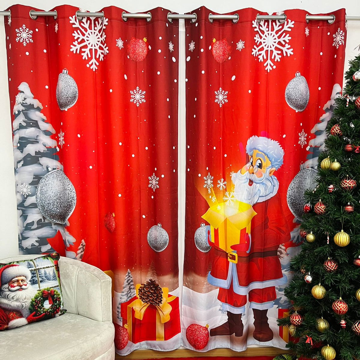Nuestras cortinas navideñas son la perfecta opción para agregar un toque festivo a tu hogar. Con dos laterales de 1.40 x 2.10 metros, cubrirán tus ventanas con elegancia y sofisticación.