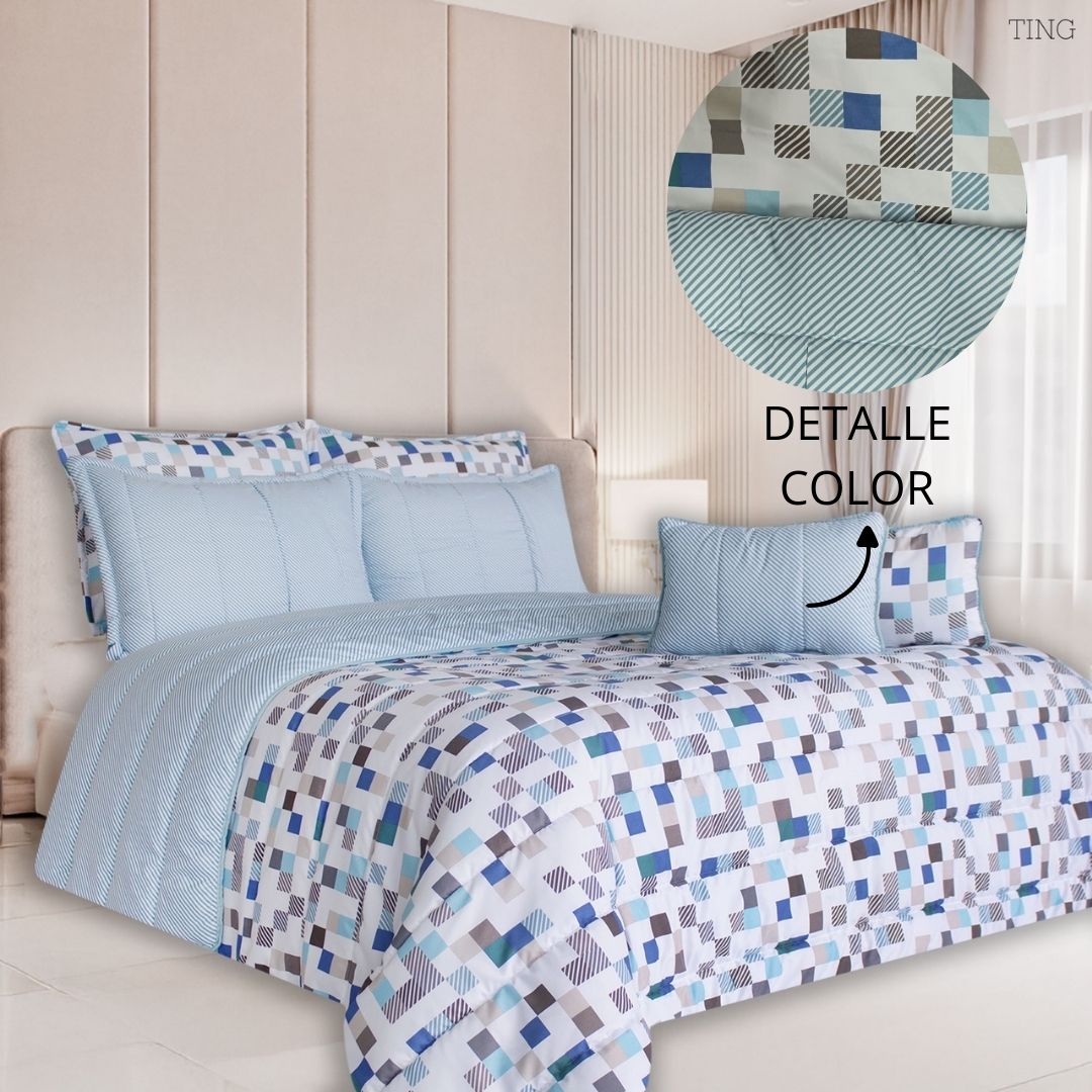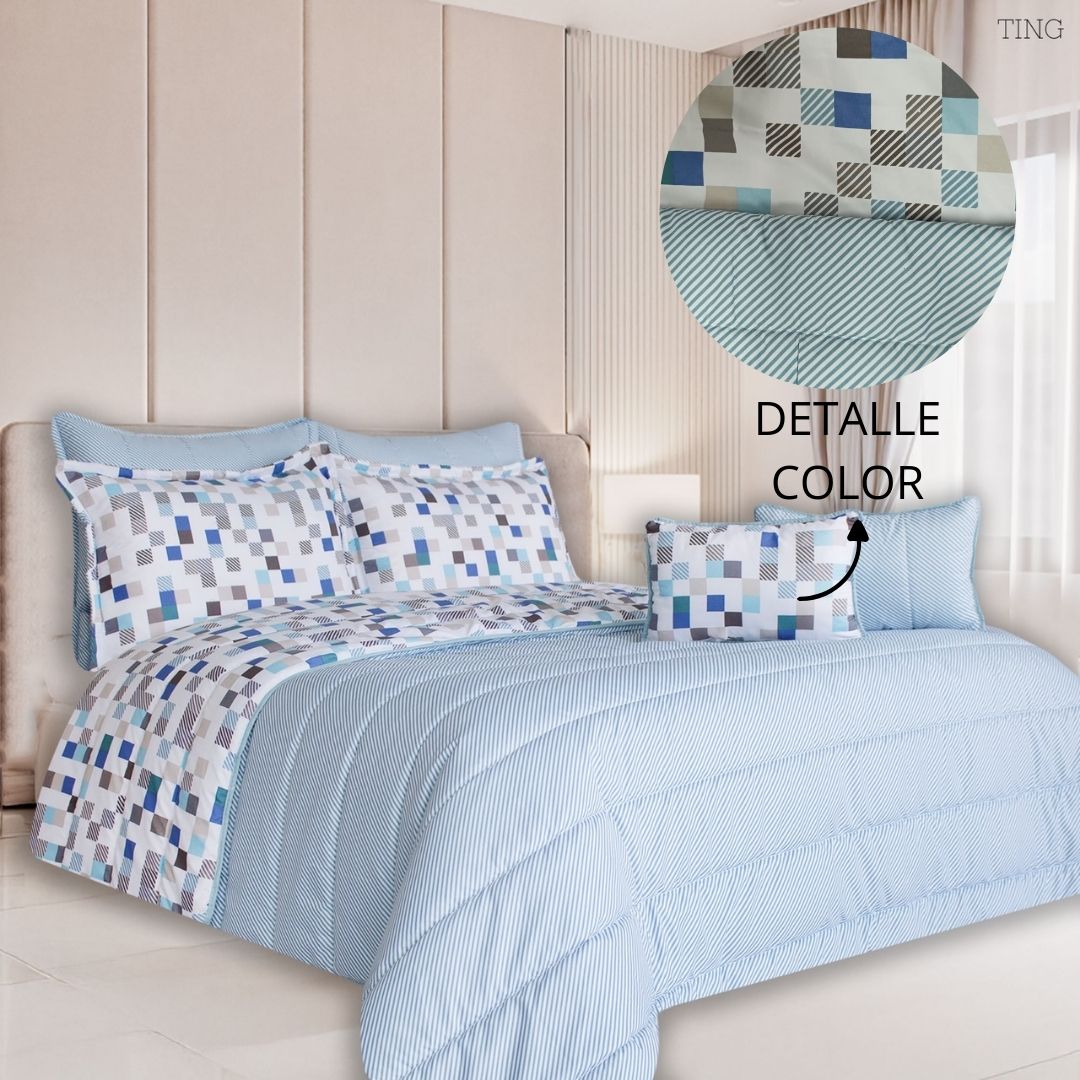 Descripción: Nuestro set de edredón doble faz te ofrece el más suave y cómodo juego de cama, diseñado con un relleno y una tela fresca para que puedas usarlo durante todo el año. Transforma completamente tu cama en un espacio acogedor para dormir con este completo set.
